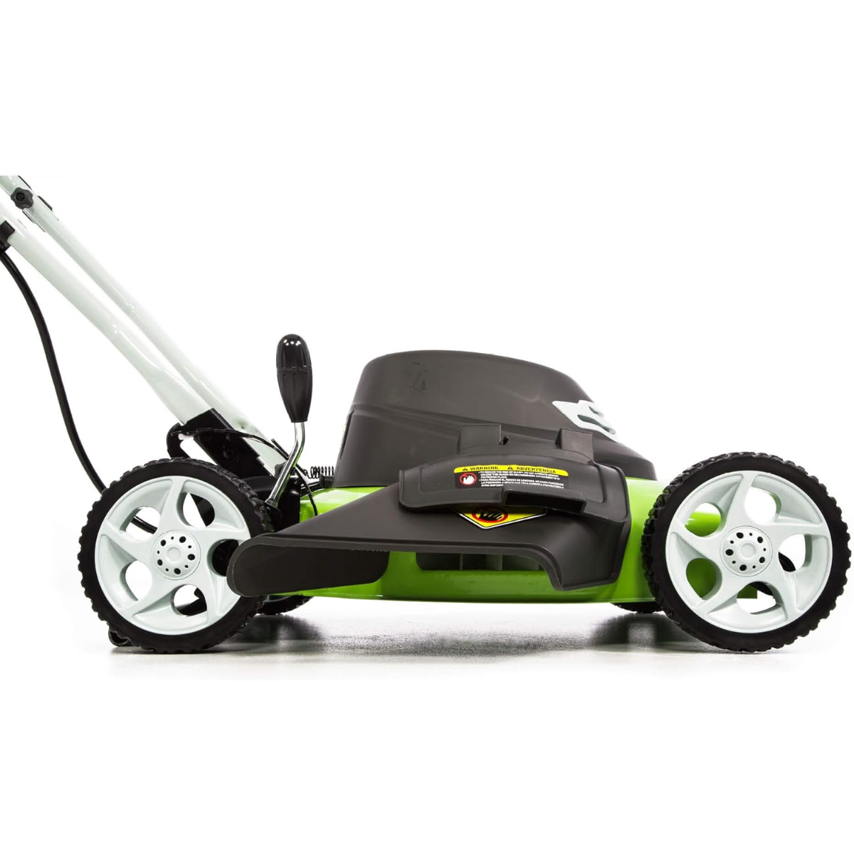 For added convenience, the mower includes a single-lever height adjustment system with multiple cutting positions, allowing users to easily select the desired grass height. Large wheels improve maneuverability around obstacles and uneven terrain, while the foldable handle design enables compact storage when not in use.